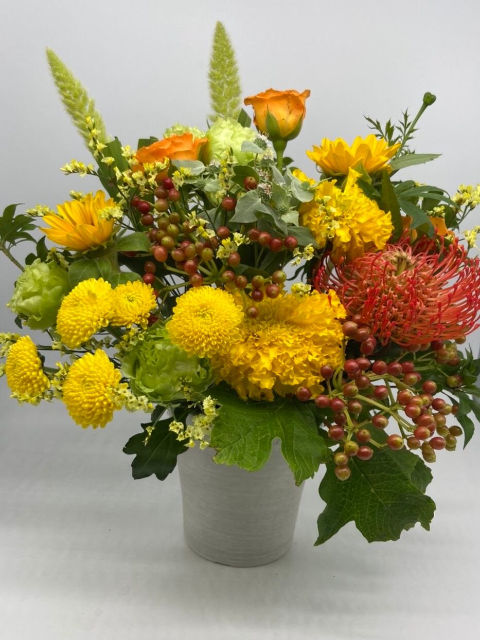 イエロー・オレンジ系のお花をメインに使用した明るく元気なイメージのアレンジメントです。(アレンジメントとは吸水性スポンジを使用してお花をアレンジした商品になります。