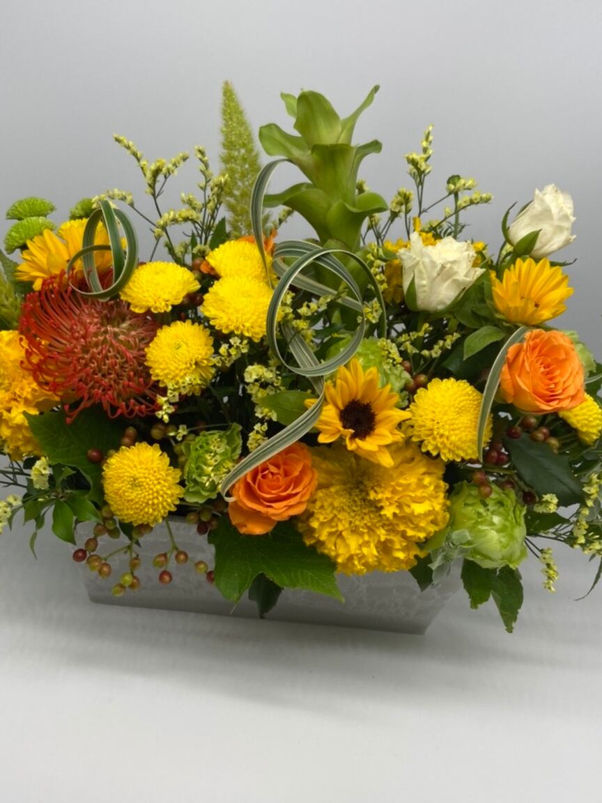 イエロー・オレンジ系のお花をメインに使用した明るく元気なイメージのアレンジメントです。(アレンジメントとは吸水性スポンジを使用してお花をアレンジした商品になります。
